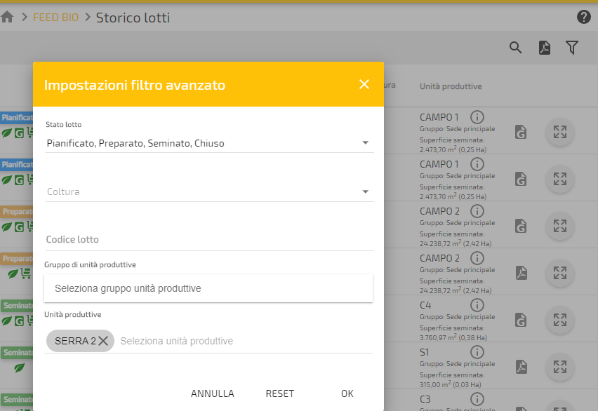 Le voci “terreni preparati” e “semine” sono state accorpate in “Lotti aperti”: il sistema permette attraverso dei filtri di selezionare solo i terreni preparati, solo i seminati o entrambi.